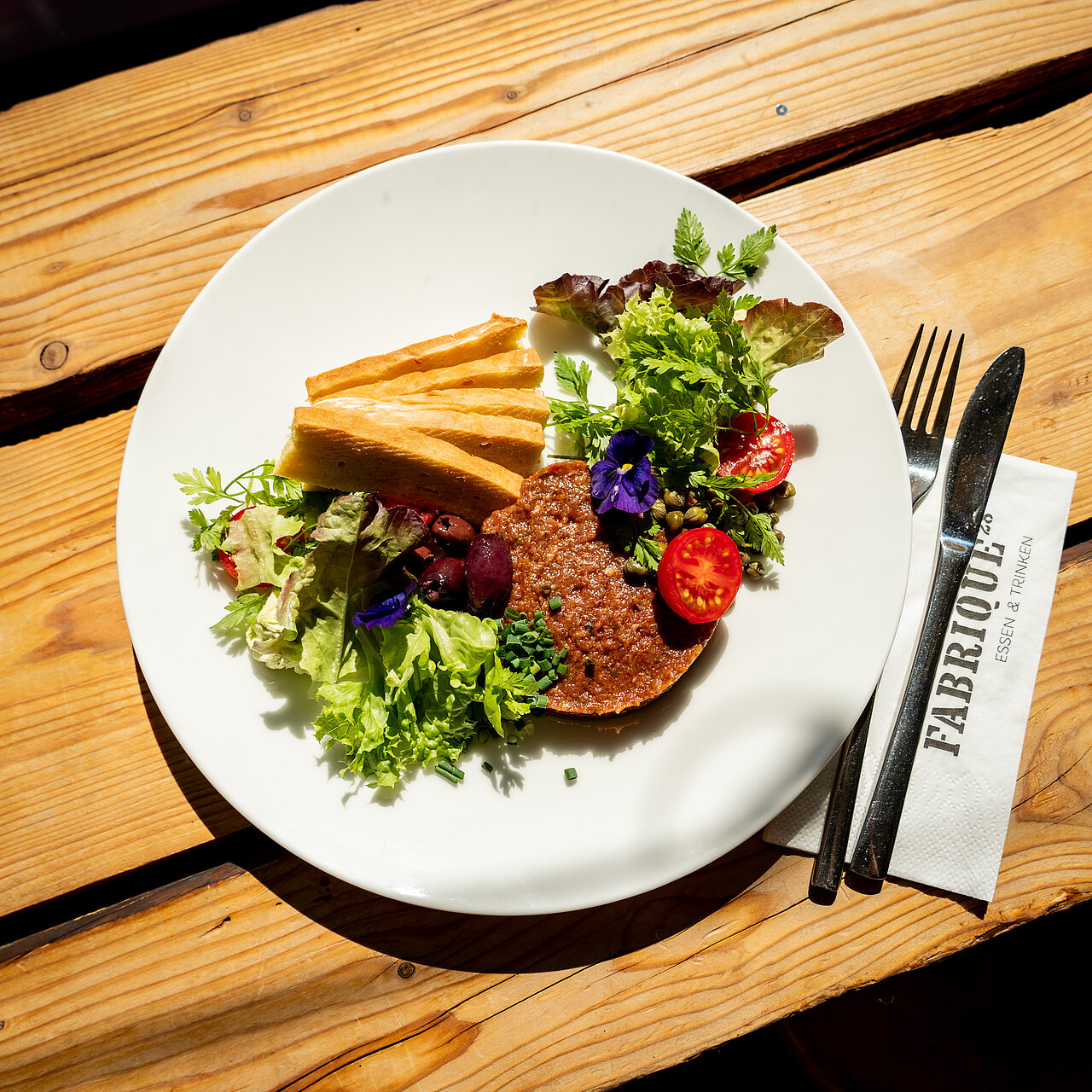 Chäsbrägu mit Brioche | Speck | Spiegelei | Feigensenf | Kräutersalat